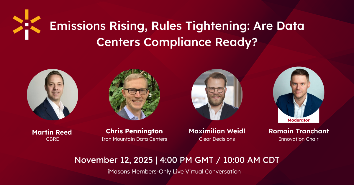 Innovation September 18, 2025 4:00 PM BST | 10:00 AM CDT Live Virtual Conversation About the Event:Join the iMasons Innovation Committee for a panel discussion on the future of power delivery in digital infrastructure. Featuring lead speaker Romain Tranchant, iMasons Innovation Chair, and panelists from RE24, Southwire, and Enchanted Rock, we’ll explore how renewable energy, resilience, and […]